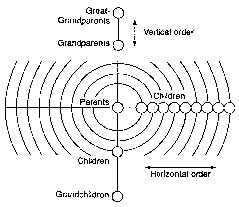 Fig. 2-8. An Example of Vertical and Horizontal Orders in the Universe The human family, in its original form, should also have had an orderly system like that of the universe. In the family, there is vertical order, which consists of grandchildren, children, parents, grandparents, and so on; and there is horizontal order, which consists of brothers and sisters centered on the parents. The vertical order and the horizontal order of the family are illustrated in Fig. 2-9. From the perspective of Unification Thought, the human being is a microcosm, or a miniature, of the universe. Considered from the aspect of order, the family is a miniature of the universe, and the universe is an enlarged form of the family. It is well known that in the universe there are innumerable planetary systems similar to the solar system. Therefore, we can assert that the universe is an aggregate of innumerable families of heavenly bodies.