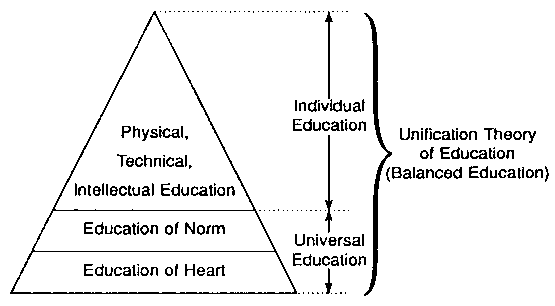 Fig. 5-2: Universality and Individuality in Education In ancient Greece, in the Middle Ages, and in the Modern Age, there was always an effort to provide education of love and education of ethical and moral principles, even though the teachings provided were not perfect. Today, however, these kinds of education are being slighted, and what can be called "unbalanced education," with excessive emphasis on knowledge and technique, is being practiced. As a result, the healthy growth of human nature is hampered. Therefore, a new theory of education must appear whereby the education of love and the education of ethical and moral principles can be given on a new dimension. It is on this basis that intellectual education and technical education should be conducted. Only through such balanced education can science and technology be guided in the proper direction. Then such problems as pollution and the destruction of nature will naturally come to be solved. Moreover, through this kind of education, teachers will regain their authority as teachers. It should be added that the starting point of education lies in family education. School education is the extension and development of family education. Accordingly, family education and school education must be united. If this is not done, it is difficult for proper education to be carried out, especially Education of Heart and Education of Norm. In that case, unity in education cannot be actualized. |