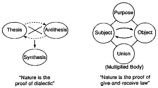 Fig. 11-7: Descartes's Methodic Doubt 3. Hume I-fume considered causality merely a subjective belief. However, causality is not merely subjective, but is both subjective and objective, as already explained in the chapter on Epistemology. Moreover, Hume denied both material substance and spiritual substance (self), holding that there exist merely bundles of impressions and ideas. From the perspective of' Unification Thought, lie saw only the inner Hyungsang (ideas) as sure things. Hume tried to establish a complete system of philosophy by analyzing mental processes, but the problem was that he tried to do it on the basis of separate impressions and ideas. 4. Kant Kant claimed that cognition takes place as the chaotic sensory content coming form the object are synthesized with a priori forms of the subject. Unification Thought agrees with the view that cognition occurs through the interaction between the human subject and the object. However, from the perspective of' Unification Thought, the subject possesses not only forms (forms of thought), but also content (images). The combination of form and content is called prototype. Also, what comes from the object is not chaotic sensory content, but content with forms of existence. Contrary to Kant's theory of synthesis, Unification Thought asserts the theory of collation. The Kantian theory of synthesis, which is based on the transcendental method can be regarded as an expression of tire Unification Thought theory of collation, which is based on the give-and-receive method, from Kant's position. 5. Hegel Hegel grasped the development of the Idea and the word as the process of transcendence and the unity of contradiction -- or the process of thesis, antithesis, and synthesis. From the perspective of Unification Thought, however, development does not occur through contradiction. Development occurs when correlatives, in the relationship of subject and object, enter into give-and-receive action centering on purpose. (This is called Chung-Boon-flap Action.) In this, Chung means purpose, Boon means correlatives, and Hap means multiplied body. The Idea does not develop by itself through the contradiction within, as Hegel claimed. Thinking is carried out as the inner Sungsang -- namely, the functions of intellect, emotion, and will-act upon the inner Hyungsang (including ideas), forming new ideas. This is called the development of thinking in a spiral form, as was explained in the chapter on Logic. It can be seen that Hegel grasped development-which, according to Unification Thought, is give-and-receive action between correlatives-as interaction between opposing elements. 6. Marx Marx held that spiritual processes are the reflection of material processes. From the perspective of Unification Thought, however, Sungsang (spirit) and Hyungsang (matter) are in the relationship of subject and object; therefore, there is a relationship of correspondence between spiritual laws (laws of value) and material laws. As a counterproposal to the "law of the transformation of quantity into quality," Unification Thought offers the "law of balanced development of quality and quantity." From quantity to quality is not correct. Also, a sudden qualitative change does not occur when the quantitative changes reach a certain point. Quality and quantity are in the relationship of Sungsang and Hyungsang, and they change simultaneously, gradually, and stage by stage. As a counterproposal to the "law of the unity and struggle of opposites," Unification Thought proposes the "law of the give-and-receive action between correlatives." The struggle of opposites gives rise only to destruction and ruin, and never brings about development. All things develop through the harmonious give-and-receive action between correlatives centered on a common purpose. To the "law of negation of negation," Unification Thought proposes, as counterproposal, the "law of affirmative development." In nature, as well as in society, development takes place as the correlative elements of subject an(] object within nature and society perform harmonious give-and-receive action. In nature, inorganic beings perform circular motion in space and living beings perform circular motion in time (spiral motion). Among the methodologies in the past, none was more influential than the Marxist materialist dialectic. Trying to prove that Marx's dialectic was valid in nature as well, Engels studied natural sciences for eight years. As a result, lie concluded that "nature is the proof of dialectics." 7 The errors of the materialistic dialectic are now evident, however. Natural phenomena are, if examined well, not the .proof of dialectics," but instead the "proof of the give-and-receive method" (Fig. 11-8). 7. Husserl Husserl first started with things of the natural world. Things are, when seen from the perspective of Unification Thought, the unified bodies of Sungsang and Hyungsang. Next, he advocated the intuition of essences through eidetic reduction. Essence here