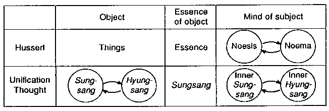 Fig. 11-8: Dialectic or Give-and-Receive Action corresponds to the Sungsang of existing beings. In addition, Husserl claimed that when judgment is suspended and consciousness (pure consciousness) is analyzed, there is a structure of noesis and noema. This, when seen from the perspective of Unification Thought, corresponds to the internal structure of Sungsang (mind), which consists of inner-Sungsang and inner-Hyungsang. A comparison between Husserl's phenomenological method and the viewpoint of Unification Thought would be as in Fig. 11-9.