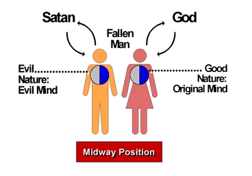 Throughout this fallen world which Satan rules as its false master, God's efforts to divide good from evil have continued, and as a result, most of human history is composed of the struggles between good and evil. Fallen man united with Satan with his mind and commits sin through his body, yet man also has his original mind created by God still within him, and it always remains directed toward God. Man is caught in the midway position. On one hand, the evil sovereignty of Satan is trying desperately to hold on to man, while on the other hand, the good sovereignty of God is striving to win man to His side. Thus, there is always a continuing battle to win man over to one side or the other. This is the true picture of human history: good and evil are in conflict in this world.