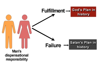 But man may or may not fulfill his responsibility toward God. When men do accomplish their responsibility, God's plan comes to be concretely reflected in history and restoration progresses. But when men fail to fulfill their responsible part, God's plan for that time is frustrated, and Satan's will comes to be reflected in history instead. Thus, man can accomplish or fail his responsibility. The reason human history appears as nothing but a constant reenactment of sinful history with the prospect of an ideal world seemingly so distant is not because God is impotent or not absolute, but because so few men accomplished their portion of responsibility to fulfill God's providence.