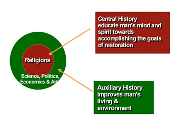 From the providential viewpoint, the history of religions also occupies the central part of God's dispensation, because they are to educate man's mind and spirit towards accomplishing the goals of the restoration of mankind. Other fields, such as politics, economics, science and culture are meant to improve man's living environment, and thus their histories can be considered auxiliary ones.