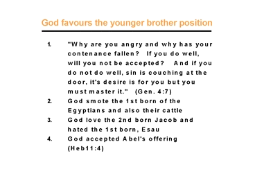 In Gen. 4:7, God said to Cain, "Why are you angry and why has your countenance fallen? If you do well, will you not be accepted? And if you do not do well, sin is couching at the door; it's desire is for you but you must master it." This shows that Cain was placed in a position to deal with Satan. When the Israelites fled out of Egypt, God smote not only all the first-born of the Egyptians but also of their cattle (Ex. 12:29). Also, God loved the second son Jacob and hated the first son Esau while they were still in their mother's womb (Gen. 25:23). And in the case of Jacob's blessing of his grandsons, Ephraim and Manasseh, he blessed them by crossing his hands to lay the right hand on the head of Ephraim, the second son (Gen. 48:14). These are all examples of how God placed every second-born child in the favored position.