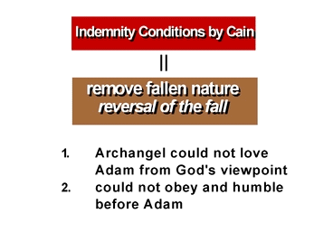Since the first human ancestors fell due to the archangel, inheriting and passing on his fallen nature, the only acceptable condition was to reverse this process. The archangel, who separated himself from God, must love Adam from the same position as God, and through obeying and humbling himself before Adam, go through him as a mediator to come back to God, thus coming to perfection; but he failed to do that. (Therefore the condition of indemnity to remove the fallen nature must be established in the reverse order of the fall.)
