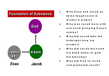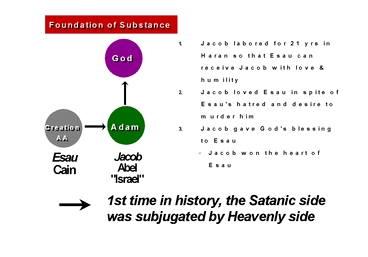 Although it does not seem to have any personal consequence to us today, the Bible greatly emphasizes the details of the history of the Israelites for the reason just mentioned. God sent so many prophets to the Israelite nation and protected it with much love because it was the fruit of the many years of God's providence, and thus He built the foundation for subjugating Satan on the national level. Moreover, it is the very foundation upon which the Messiah, the Abel of all Abels, must come. The tradition of Israel was founded by Jacob, in the position of Abel (on God's side) by his subjugating Esau who was in Cain's position (on Satan's side). This tradition was meant to be the exemplary course for the chosen people of Israel, who, in the position of Cain, were to trust, obey and love Jesus, the Abel for all mankind, in order to realize the Kingdom of Heaven.