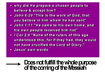 However, tragically, the much-prepared chosen people failed to recognize the Messiah when he came. The Son of God was left with no other choice but to persuade the people himself that he was the Son of God, yet he was not understood, branded as blasphemous, and ultimately crucified. Even Pilate, a pagan ruler, knew of Jesus' innocence, yet ironically the people who condemned Jesus were the chosen people and prepared Jewish leaders themselves. How could this have happened?