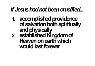 To put it clearly, Jesus' crucifixion was only a secondary course of salvation, and provided only spiritual salvation. Because Jesus was neither trusted nor received by the Israelites, God had to pay the price for the sinful distrust of all mankind by giving His only Son to Satan as a ransom. Therefore, Satan could claim Jesus' body. This is why Jesus' precious blood on the cross became the price for the redemption of all mankind.