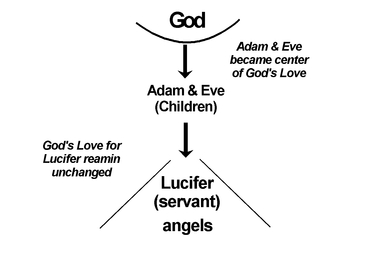 However, after God created Adam and Eve, who were to be His children, God loved them more than the archangel himself who was created to be man's servant. In actuality, God loved Lucifer just as much as before, but when Lucifer saw that God loved Adam and Eve more than himself, he began to feel that the love he was receiving from God had diminished. Because of this, Lucifer tried to come closer to Adam and Eve in order to supplement the love he was receiving.