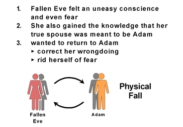 After Eve and the archangel committed the spiritual fall by uniting their spiritual bodies in illicit love, Eve began to feel an uneasy conscience and even fear with the additional knowledge given to her by her actions. She then understood that her true spouse was meant to be Adam and not the angel. With this added new wisdom, she then wanted to return to Adam, in part to correct her wrongdoing and in part to be free from the sensation of fear derived from her fall. So, she seduced Adam and this second fallen act of love we call the physical fall.