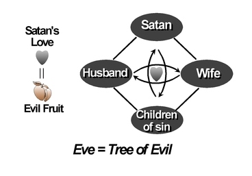 But imperfect Eve had an illicit love relationship with the archangel and instead became a false woman, furthermore causing Adam to fall, and together becoming the origin of the fallen family upon which God cannot operate. Therefore, fallen Eve herself can be likened to a tree of evil and her love, the fruit of evil.