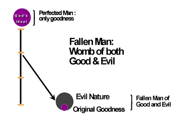 As was already explained in the section on the fall of man, man fell while still growing to perfection to become the substantial ideal of creation. As a result, fallen man has come to have the potential for both good and evil. In other words, man, who is still imperfect, contains both the original goodness given by God as well as the evil nature that he inherited from the fallen angel. This evil element from the fallen angel is the original sin.