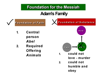 As was explained earlier, the foundation upon which the Messiah can come is the restored foundation of faith and foundation of substance. In Adam's family, a successful foundation of faith was laid by Abel's making an offering which God could accept. With the same successful sacrifice Abel also qualified himself to become the central figure to establish the foundation of substance. However, as a result of Cain's killing Abel, they failed to establish the condition of indemnity to remove the fallen nature, thus collapsing the foundation of substance, and in turn, failing to form the foundation for the Messiah. Thus God's providence could not be fulfilled in Adam's family.