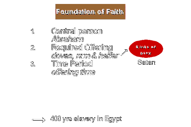 Abraham offered the sacrifice of the doves, ram and heifer as the conditional objects to restore the foundation of faith (Gen. 15:9). According to Gen. 15:10-13, Abraham cut the offerings in two and laid each half over against the other, but he did not cut the doves in two. Birds of prey, symbolizing Satan came down upon the carcasses and Abraham drove them away. Then God appeared to Abraham and said to him: "Know of a surety that your descendants will be sojourners in the land that is not theirs, and will be slaves there, and they will be oppressed for 400 years…" (Gen. 15:13). Thus, because Abraham did not cut the doves in two, the Israelites had to suffer 400 years of slavery in Egypt