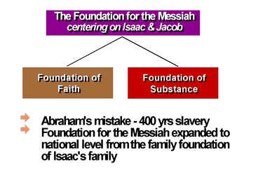 When Esau and Jacob successfully established the foundation of faith and the foundation of substance, the foundation to receive the Messiah, long sought since Adam's time, was laid for the first time. However, because Abraham had already failed in his first offering, his descendants still had to go through the indemnity of 400 years of slavery. Therefore, God internally expanded His providence to the national level upon the base of the family foundation for the Messiah established by Isaac's family. Externally, however, Isaac's descendants still had to undergo the 400 years of slavery as indemnity for Abraham's failure in the first offering.
