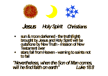 The stars symbolize the saints who are under the light of truth; therefore, this is a warning to the saints to take heed and not fail to recognize the Lord when he comes. Luke 18:8 says, ". . . nevertheless, when the Son of man comes, will he find faith on earth?" It is a prediction by Jesus that in the Last Days the Christians might be likely to fail to believe in the Lord.