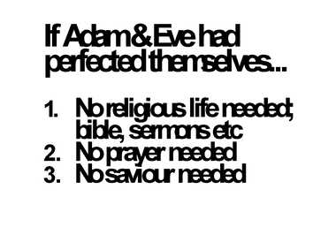 Thus, if Adam and Eve had perfected themselves in the Garden of Eden, would they ever have needed prayer, a religious life, or a savior? Why would prayer have been necessary for those who were living and communicating with God day and night? Religious life is one of continuous search for God by fallen man; a perfected man who lives his daily life as a temple of God would have no need for ritual. Therefore, if man had not fallen in the Garden of Eden, there would be no churches nor bibles, no sermons given, no revival meetings held, or the like. As beings of goodness, the normal life of the unfallen inhabitants of the Garden of Eden would have been one of inviting God to live with them. Just as those who are not drowning have no need of a rescuer, perfect men who know no sin have no need of a savior.
