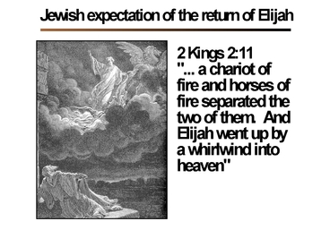 The Jewish people expect Elijah to return the same way he was taken up by a whirlwind into heaven i.e. same Elijah coming down from heaven in a flaming chariot!
