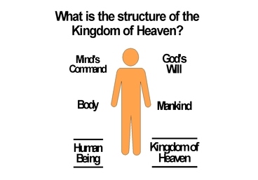 The Kingdom of Heaven is the world resembling an individual who has attained perfection. In man, the mind's command is transmitted to the whole body through the central nervous system, thus causing the body to act toward one purpose. Thus, in the Kingdom of Heaven, God's will is conveyed to all His children through the true ancestors of mankind, and under the ideal of God, causing all to work toward one purpose. Just as no part of the body would ever rebel against a nerve's command, perfect man would feel no antagonism or rebellion against God's dominion of love. Such a world would have not one iota of contradiction or crime.