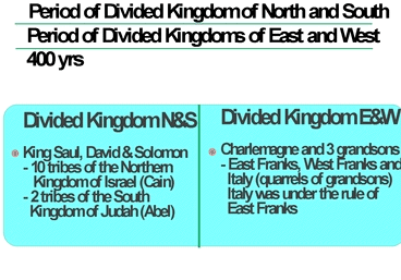 Likewise, the Christian Kingdom, which had began with Charlemagne, divided into three parts-the East Franks, the West Franks and Italy-due to quarrels between his three grand sons. However, since Italy was under the rule of the East Franks, it was actually a period of division into the Kingdoms of East and West.