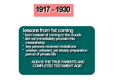 The year of 1930 is not the time we have to wait for with hope and expectation, for it is already passed. Then why haven't we witnessed on earth the glory of the Second Coming of the Messiah and the final judgment? If the Second Coming is to take place in the air, the Lord's glory already would have been brightly spread all over the world. However, as was pointed out earlier, the Lord does not come again literally on the clouds. The Second Coming is accomplished by the Messiah being born on earth in the flesh. Then is 1930 the precise year the Messiah was born? The year cannot be pinpointed so exactly because a difference of up to plus or minus 10 years was often observed throughout the providential history. For instance, the period of persecution by the Roman Empire was to be of 400 years, but to be precise, actually lasted only until 392 AD Therefore, the coming of the Messiah cannot be pinpointed as the year 1930. Two thousand years ago, when Jesus came, he did not immediately proclaim his messialiship and thereupon promptly begin the judgment. There was indeed an unseen, unheard, yet steady preparation period of private life, and a period of public ministry to prepare the foundation to realize the purpose of the Messiah's coming. Likewise, the Lord of the Second Advent must also go through this course of preparation after his birth. Therefore, we can see that in view of the providence of restoration, this is now the time of preparation for the Lord's appearance.