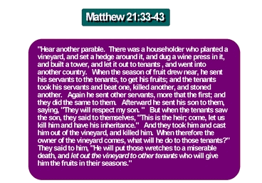 Jesus said 2,000 years ago in Israel that he would come again, but will he come again among the Jewish people? In Matt. 21:33-43, through the parable of the wicked tenants, Jesus clearly indicated that he will not come again in the land of Israel, where he had been killed. Moreover, he said he would reclaim their right to be the chosen nation and give it to a nation and people who will be fruitful for the Second Coming.
