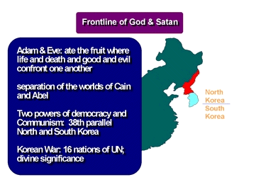 Therefore, where our Lord comes is where the two powers of democracy and Communism confront one another; it is the focal point of both God's love and Satan's hate. That very line of confrontation is the 38th parallel in the Korean peninsula. Therefore, this line is not only the front line of democracy and Communism but also the front line of God and Satan as well.