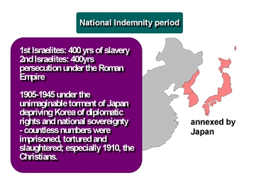 Thus, at the time of the Second Advent, the Third Israel, Korea, must also endure suffering at the hands of a particular nation on the satanic side in order to separate from Satan. In this case, it was Japan, and for 40 years it brought unimaginable torment upon Korea. In 1905, Japan forcibly deprived Korea of its diplomatic rights and this brought on a period of loss of national sovereignty which lasted until 1945, the year of its defeat in World War 11. During this period, the Korean people were completely deprived of their freedom by Japan, and countless numbers were imprisoned, slaughtered and underwent all sorts of extreme persecution. Especially in 1910, after Japan annexed Korea, the persecution of Christianity, which was the major foundation for Korea's independence movement, was unparalleled in its cruelty. When, on one hand, Christianity was enjoying its freedom under God's providence all around the globe, the suffering of the Korean nation, of which Christians were the core, became the condition of national indemnity to qualify it as the Third Israel.