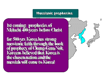 Fifth, this nation must have prophetic testimonies among the people. When God sends his beloved Son, how can He do it quietly? Certainly, He would reveal it to all prepared souls on earth, hand them the good news and have them prepare themselves. Just as the Jewish people knew through the prophets that the Messiah would come as a king and save them, for 500 years, Korea also had a strong messianic faith through the Chung-Garn-Nok, a book of prophecy. It was written in the time of the providence when God's salvation through the Messiah was not immediately available. It is characteristic of Korea to have been nurtured by this unique messianic thought.
